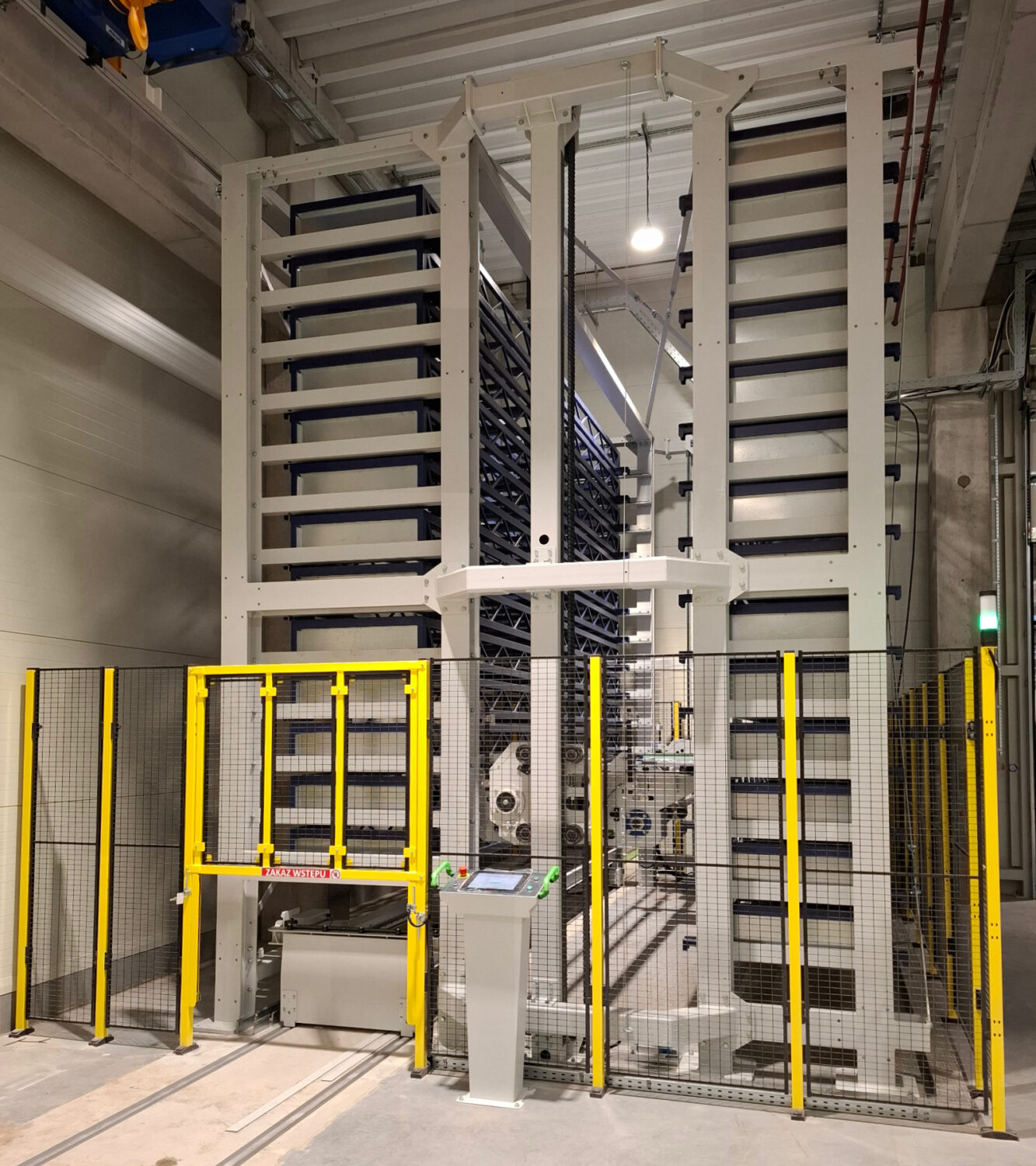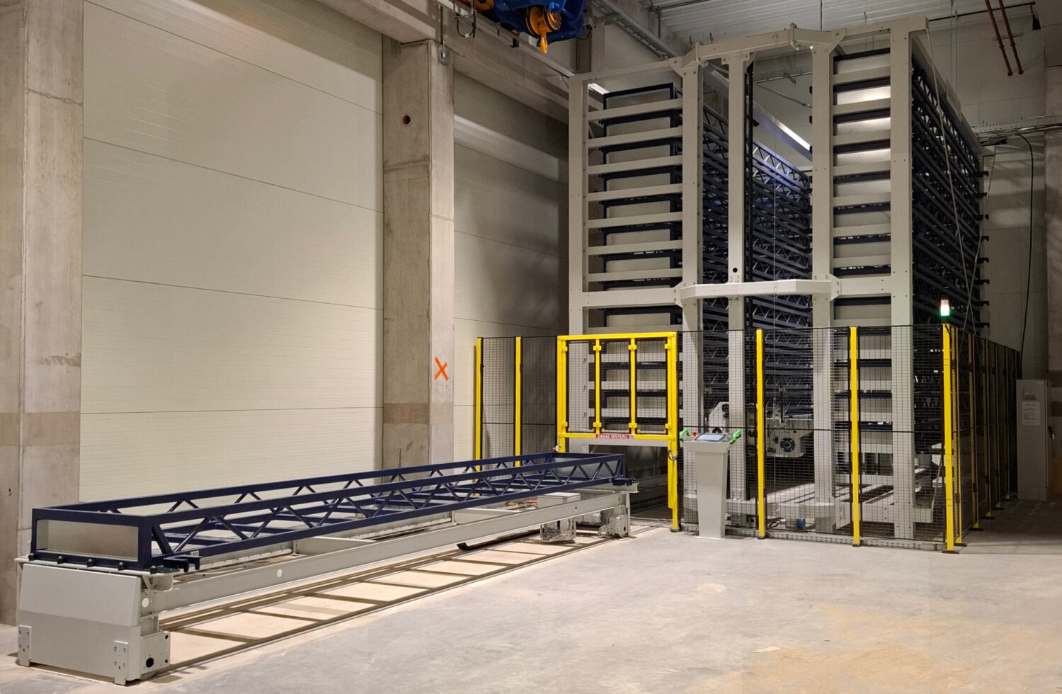 Storage system is equipped with 27 movable shelves, each with a load capacity of 3,000 kg. Loading and unloading is carried out by a mobile station moving on the track built into the floor. The station has the option of exiting on both sides of the storage column.