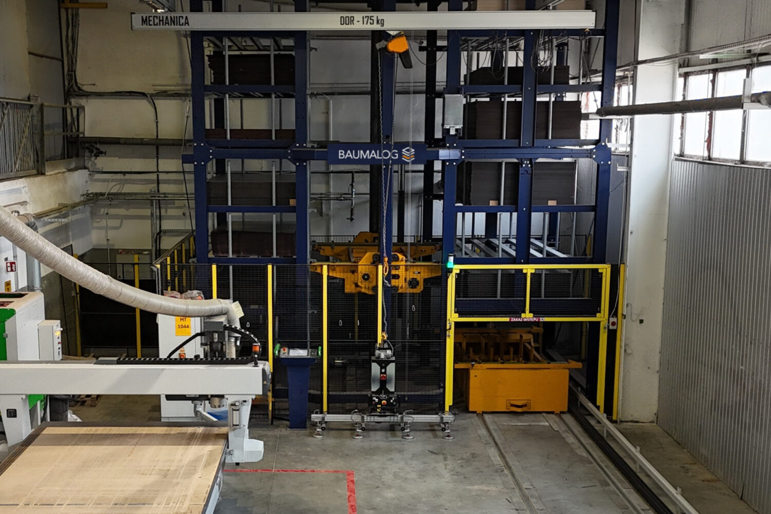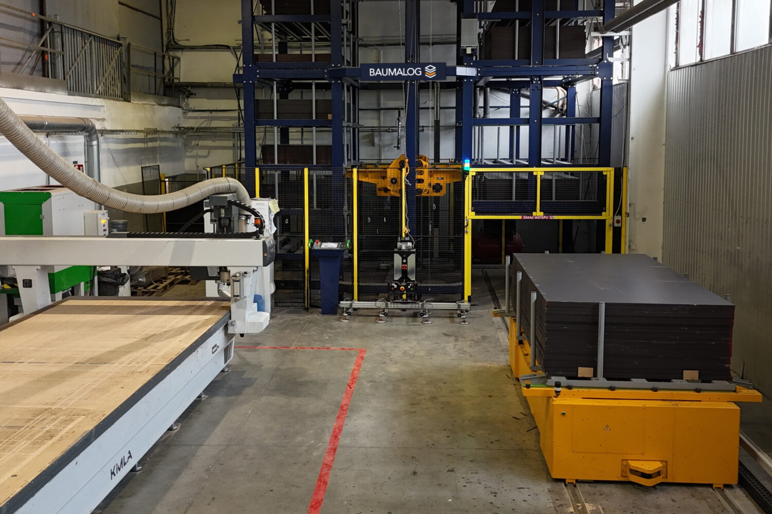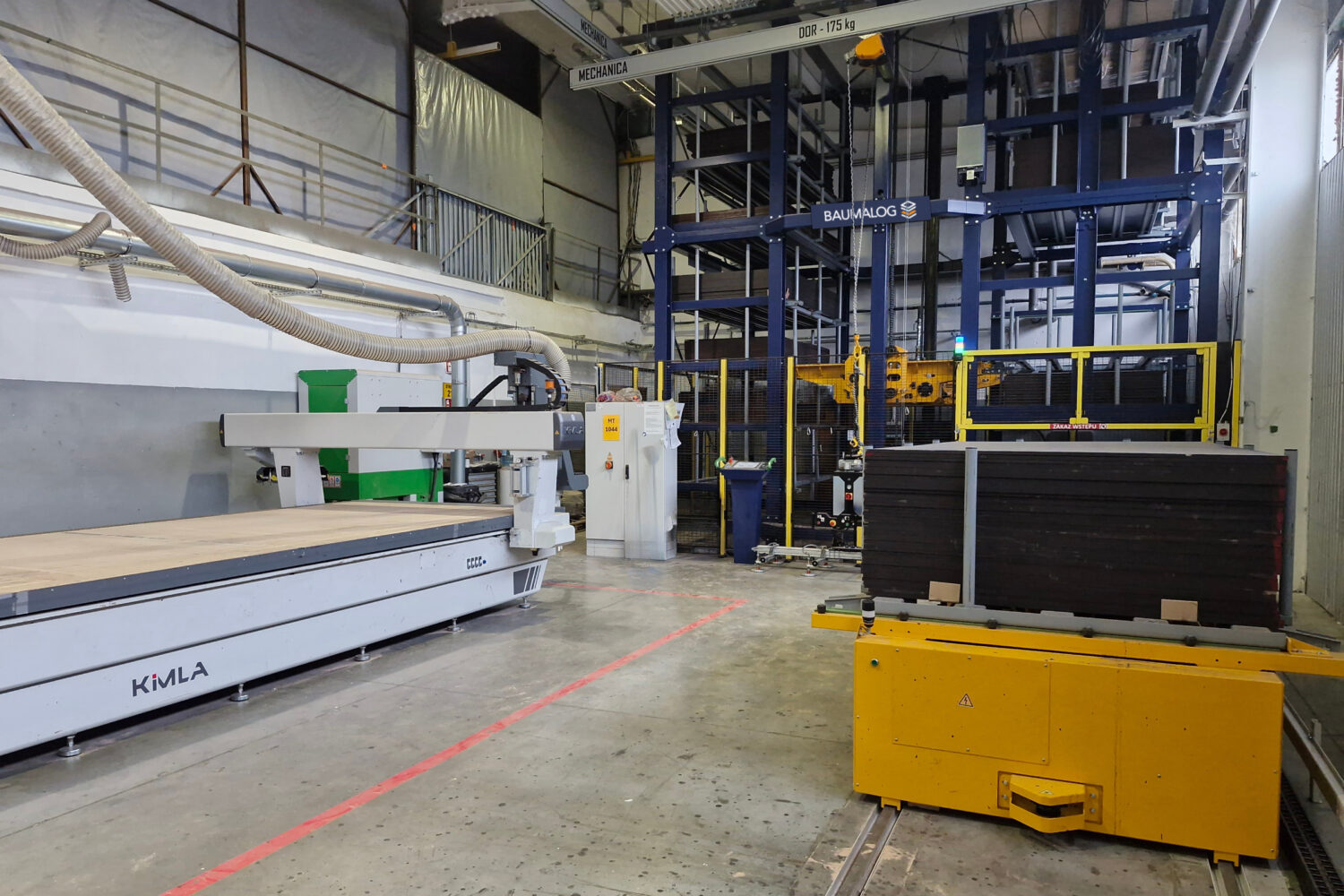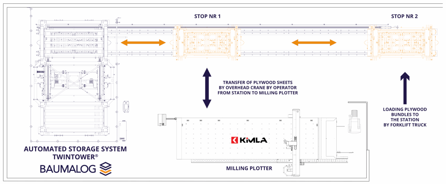 The storage system is equipped with 13 movable shelves, each with a load capacity of 2,000 kg. The transport of the material off the storage system is provided by a mobile automatic station, moving on a track more than 13 m long. One of the station’s stops is next to the KIMLA milling plotter, and the other is at the loading point for whole plywood packages.