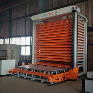 The system contains 17 shelves with a capacity of 3 t each and is instaled close to the production machines. The sheets are stored on the shelves without pallets, which makes full use of the available space, and the separation of the sheets from the pallets takes place on a solid depalletiser, with which the system is equipped.