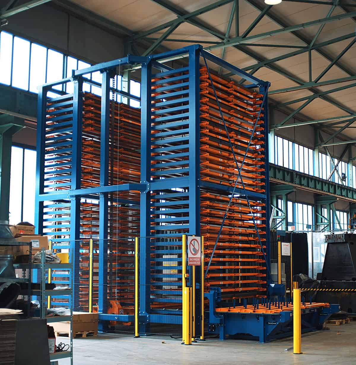 TwinTower® automated storage system, designed and implemented by Baumalog, helped to store packets of steel plates, measuring 3 x 1,5 m. System reduces storage space, decreased access time and facilitates warehouse maintenance. System consists of automated storage system with 59 trays, designed to store steel plates. Loading and unloading of plates is carried out by forklift or crane. Additionally, system is equipped with hydraulic scissor table to take out plates from palettes.