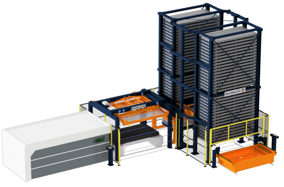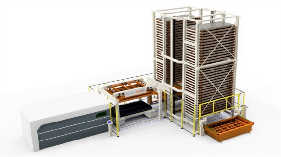 Automated loading-unloading system integrated with steel sheet storage system enables the automated loading and unloading of the laser cutting machine what significantly increases efficiency of work, enabling at the same time the fast and safe access to multiple kinds of sheets and storing the cut pieces inside the system. The construction of the system allows in case it is needed the access to the table of the laser cutting machine for the operators.